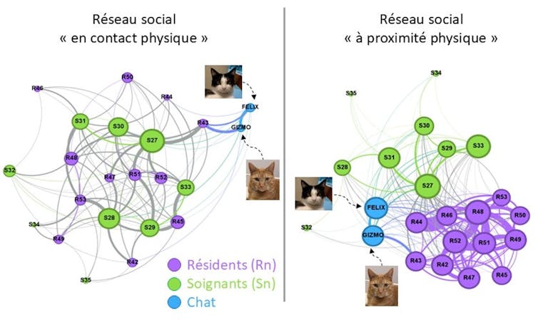 Contrairement à nos attentes, la visualisation d’aucun des réseaux sociaux étudiés n’a permis de mettre en évidence des différences entre les quatre unités ; suggérant que ces unités se comportent de manière similaire qu’elles aient un chat ou non et quel que soit son contexte pathologique (Alzheimer ou handicap). Toutefois, nous constatons que le chat occupe une position périphérique au sein du réseau social, avec des interactions privilégiées auprès de certains résidents.